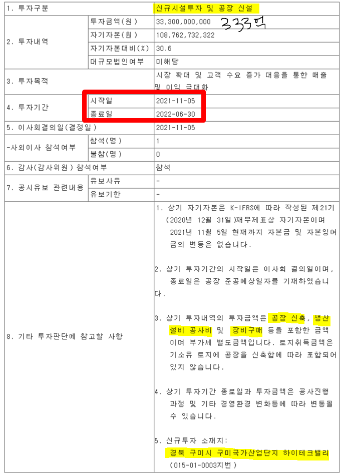구미 5공단에 333억원을 투입하여 CAPA를 증설한다는 공시가 있었습니다.