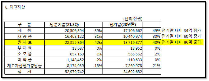 그래서 확인해봤더니 재고자산 중 재공품과 원재료부분이 증가.