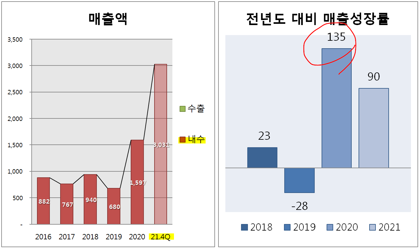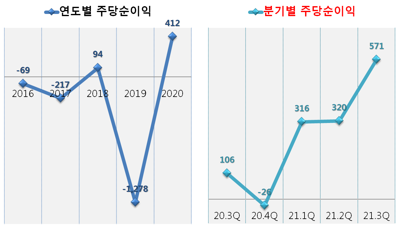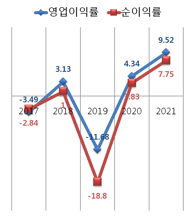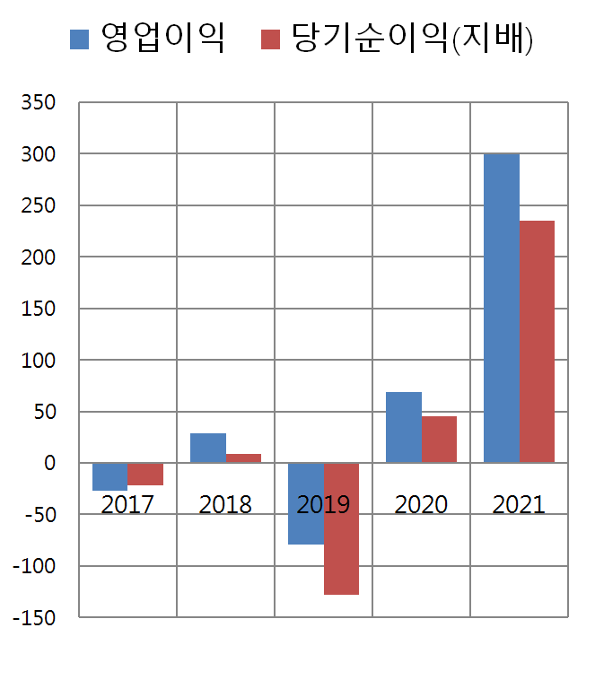 적자였던 19년도에 비해 20년과 21년은 눈에 띄게 실적이 좋아진 모습이죠?