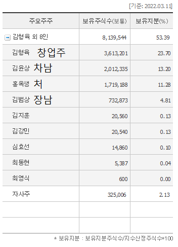 최대주주는 창업주이자 회장인 김형육(45년생:78세)으로 23.70%를 소유하고 있습니다.