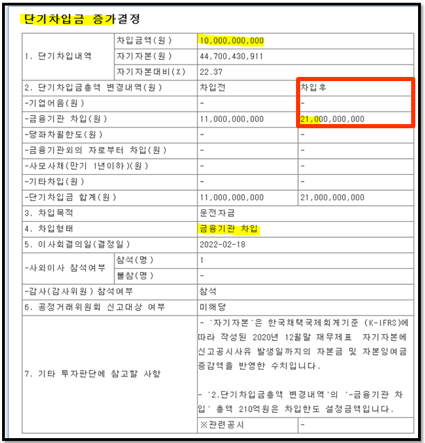 2022년 2월 18일엔 운전자금 조달 목적으로 100억원을 단기차입금한다고 공시했습니다.
