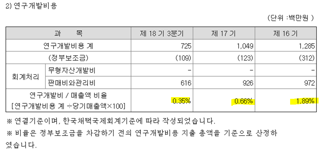 3) 신규사업인 바이오 진단기기 진출을 위해 연구개발 중이라면서 연구개발비가 너무 적음.