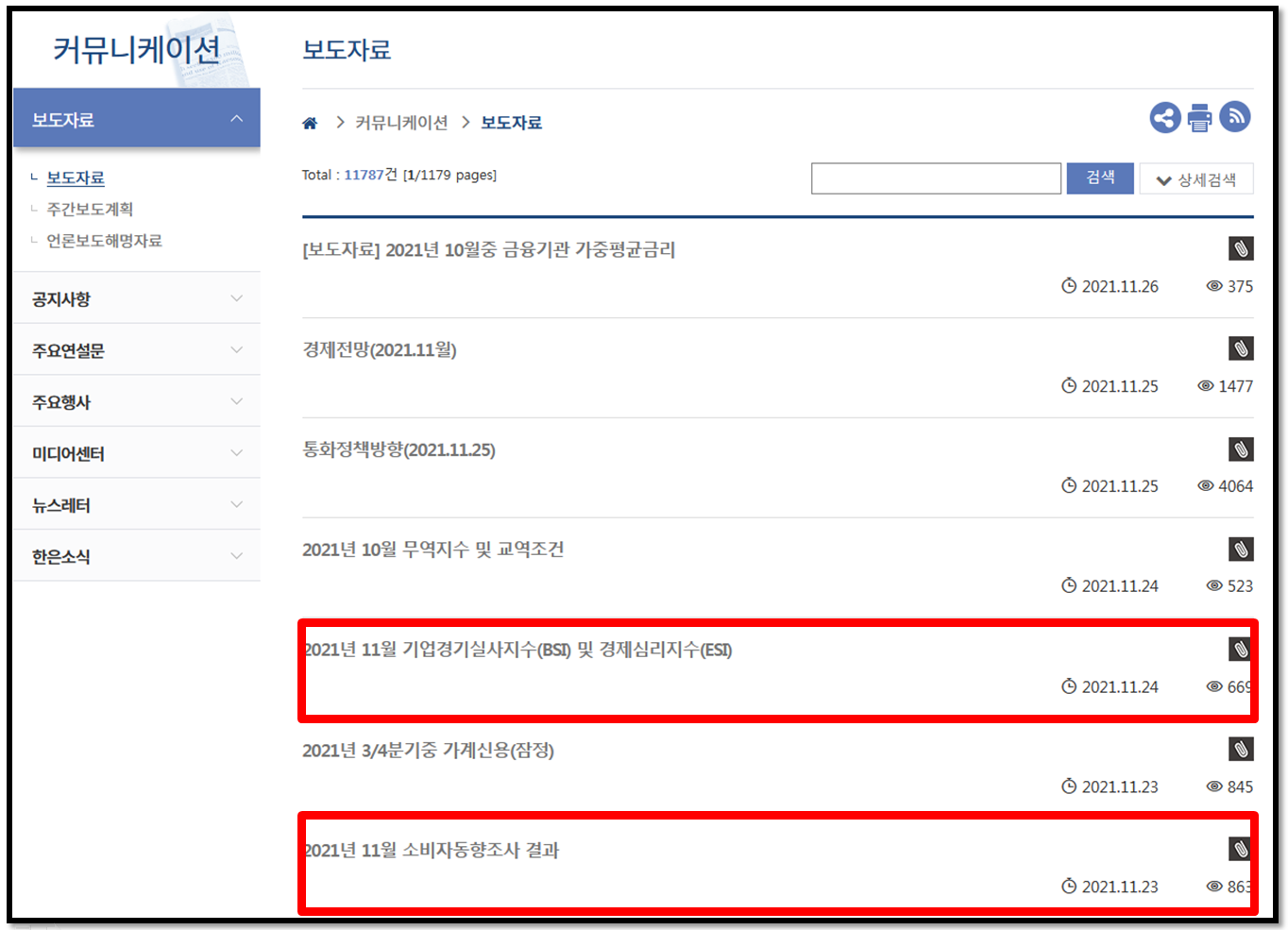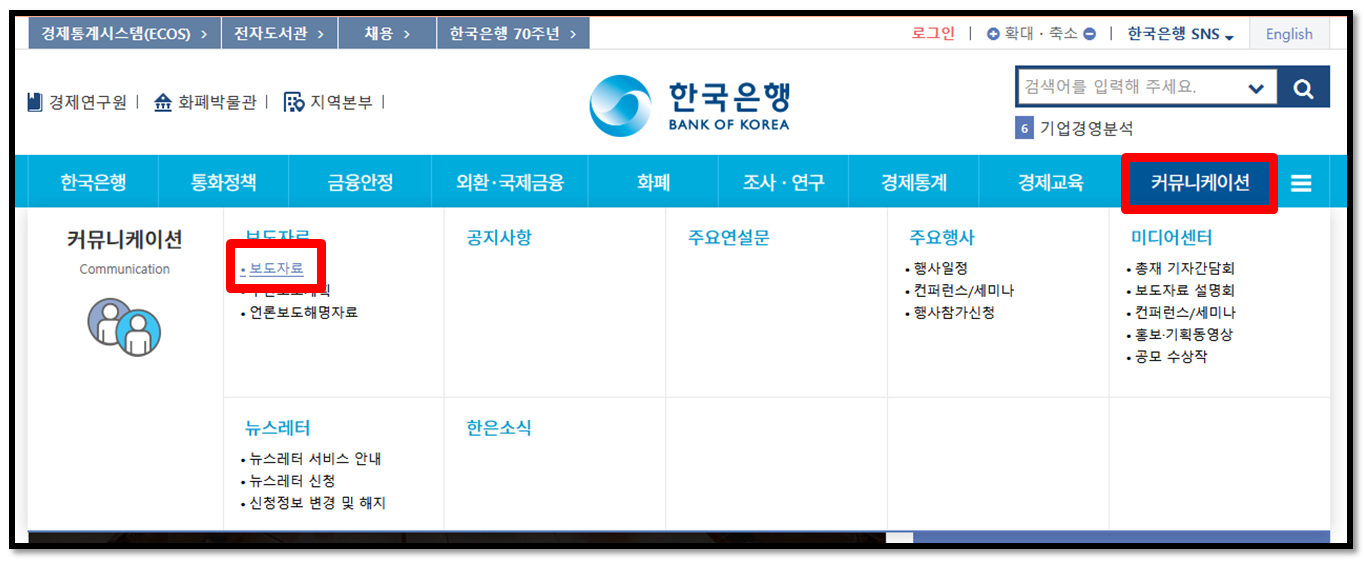 ②상단 메뉴바에서 '커뮤니케이션>보도자료'를 클릭합니다.