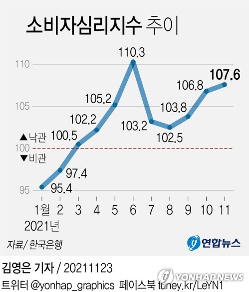 100보다 높으면 소비자가 경제상황을 긍정적으로 본다는 것을 의미하고