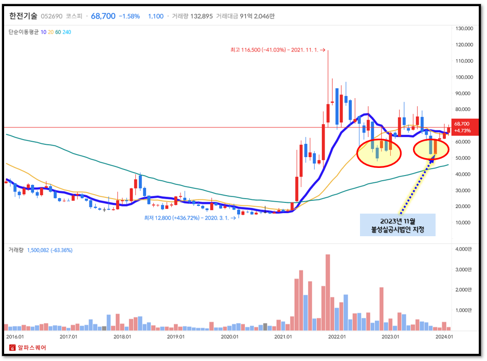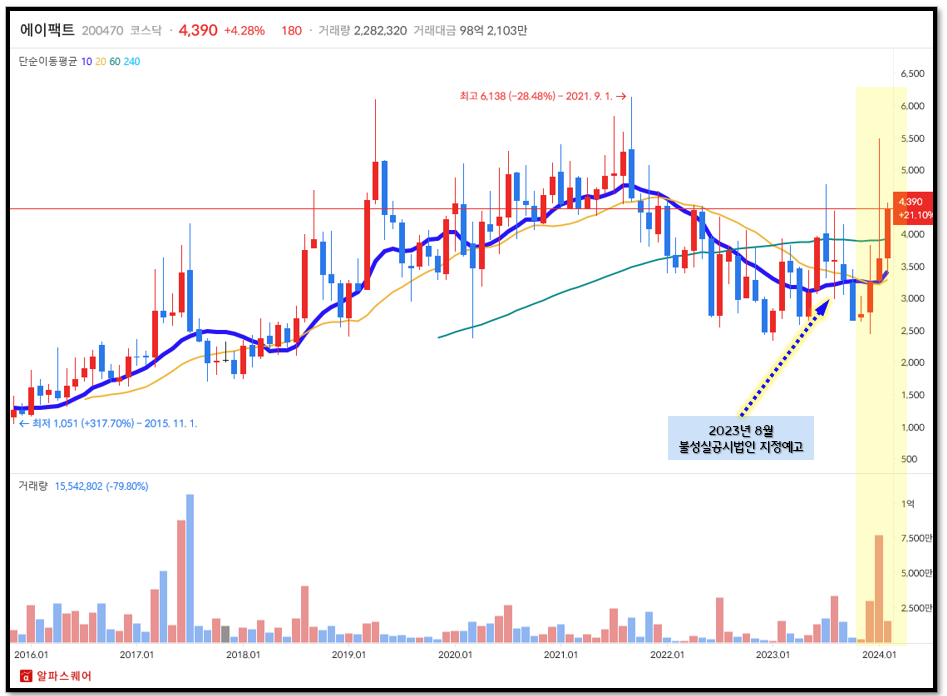 이상 불성실공시법인으로 지정된 상장사의 주가 흐름을 살펴봤습니다.